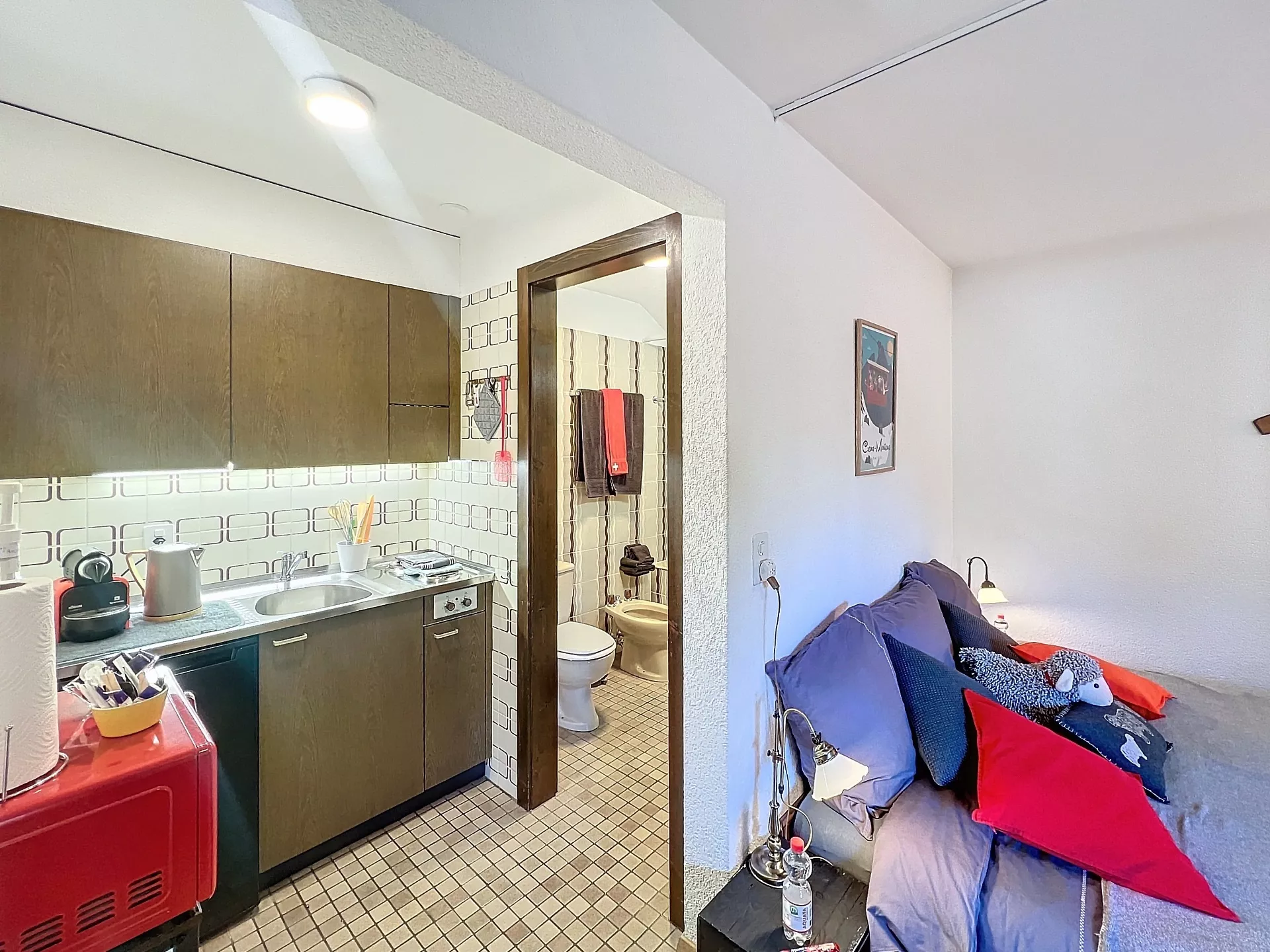 L'intérieur du studio est aménagé avec soin, offrant un espace bien agencé et fonctionnel. Une porte vitrée ouvre sur une terrasse, invitant à profiter des moments de détente en plein air.