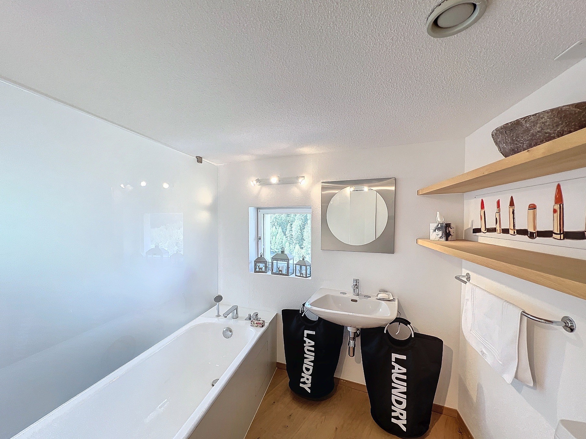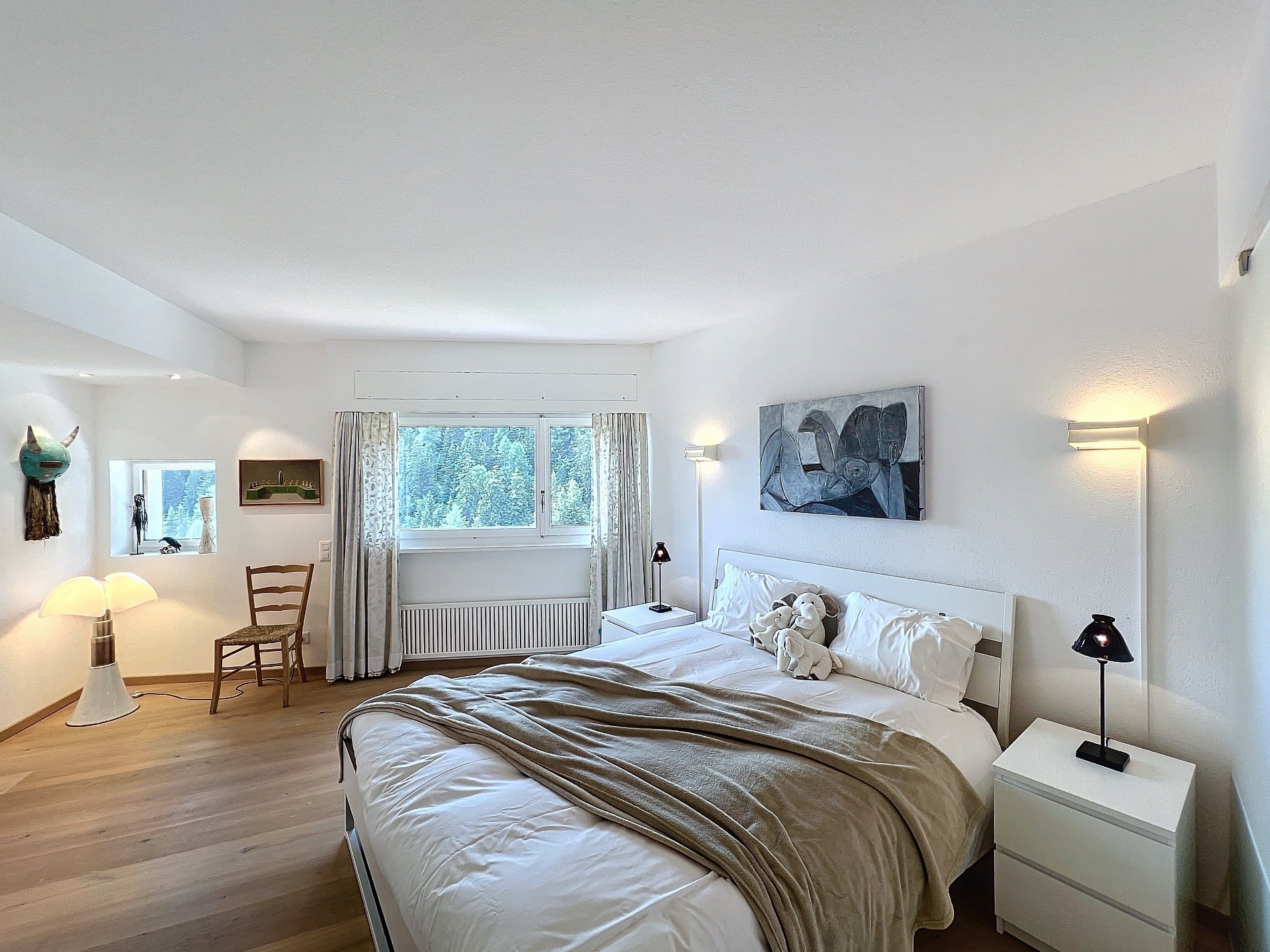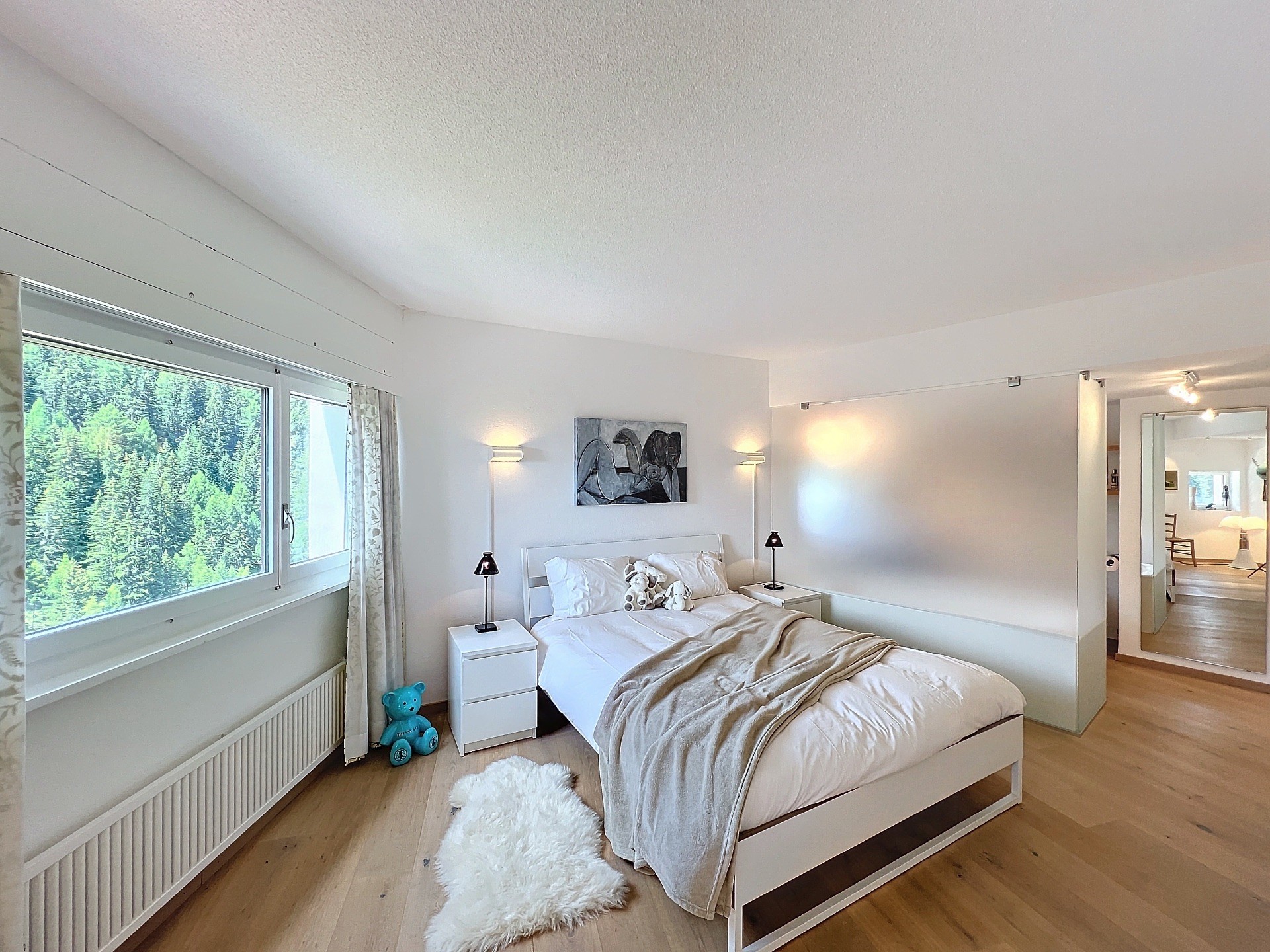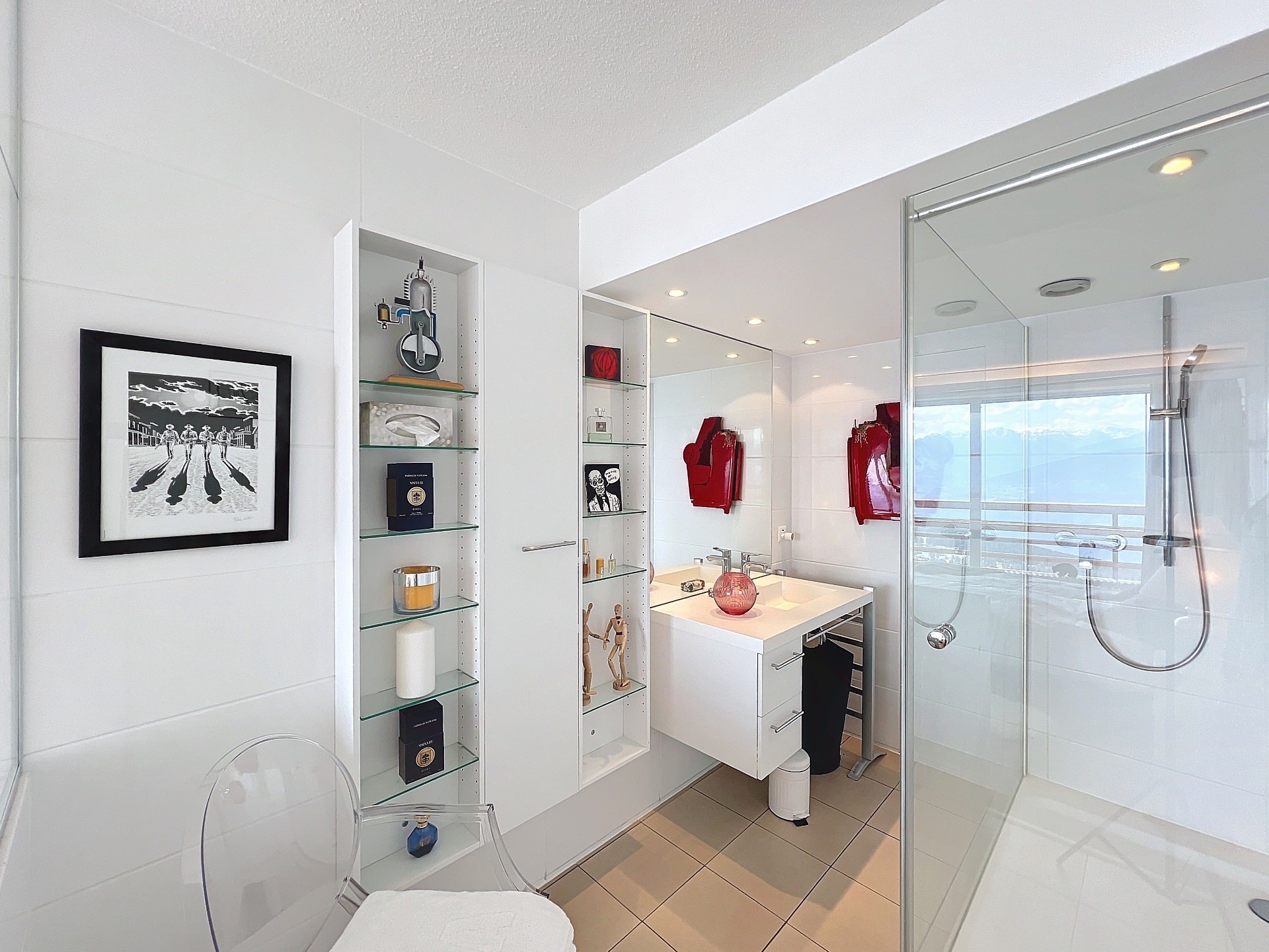 - Chambre double à l'étage décorée avec goût, salle de bain avec vue sur les montagnes.