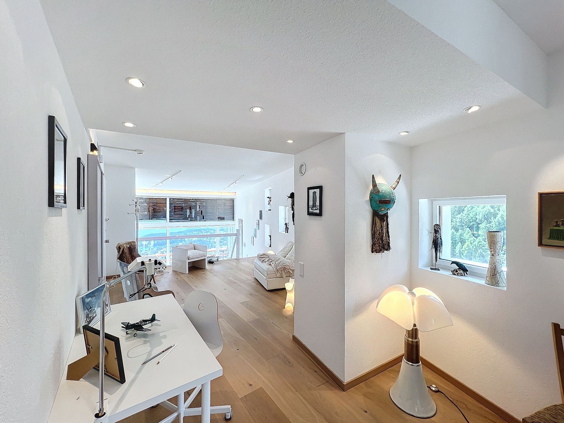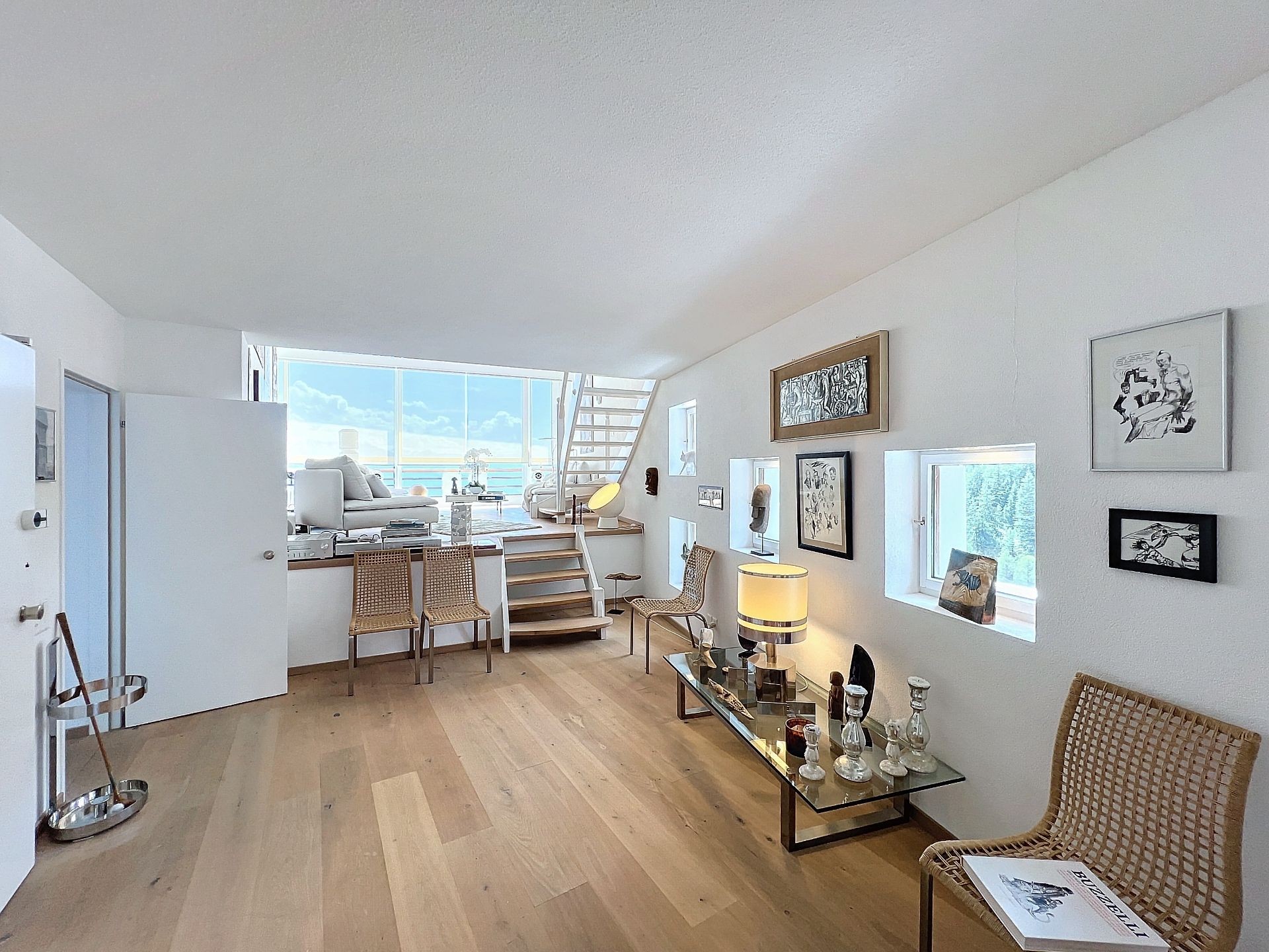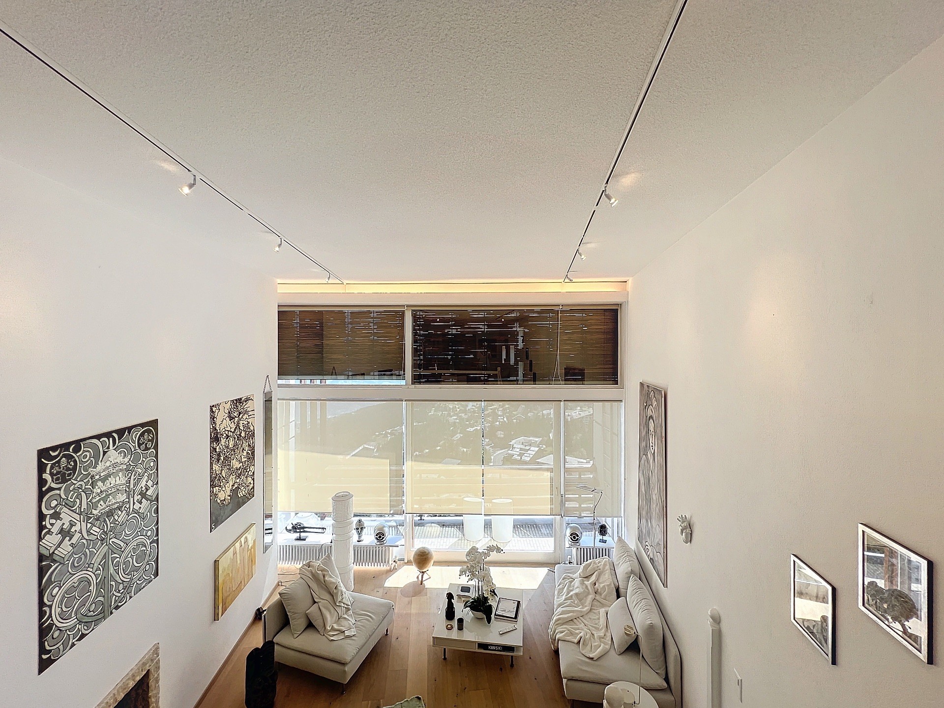 - Salon sophistiqué avec de grandes baies vitrées, permettant une luminosité optimale et offrant des vues imprenables sur les montagnes.