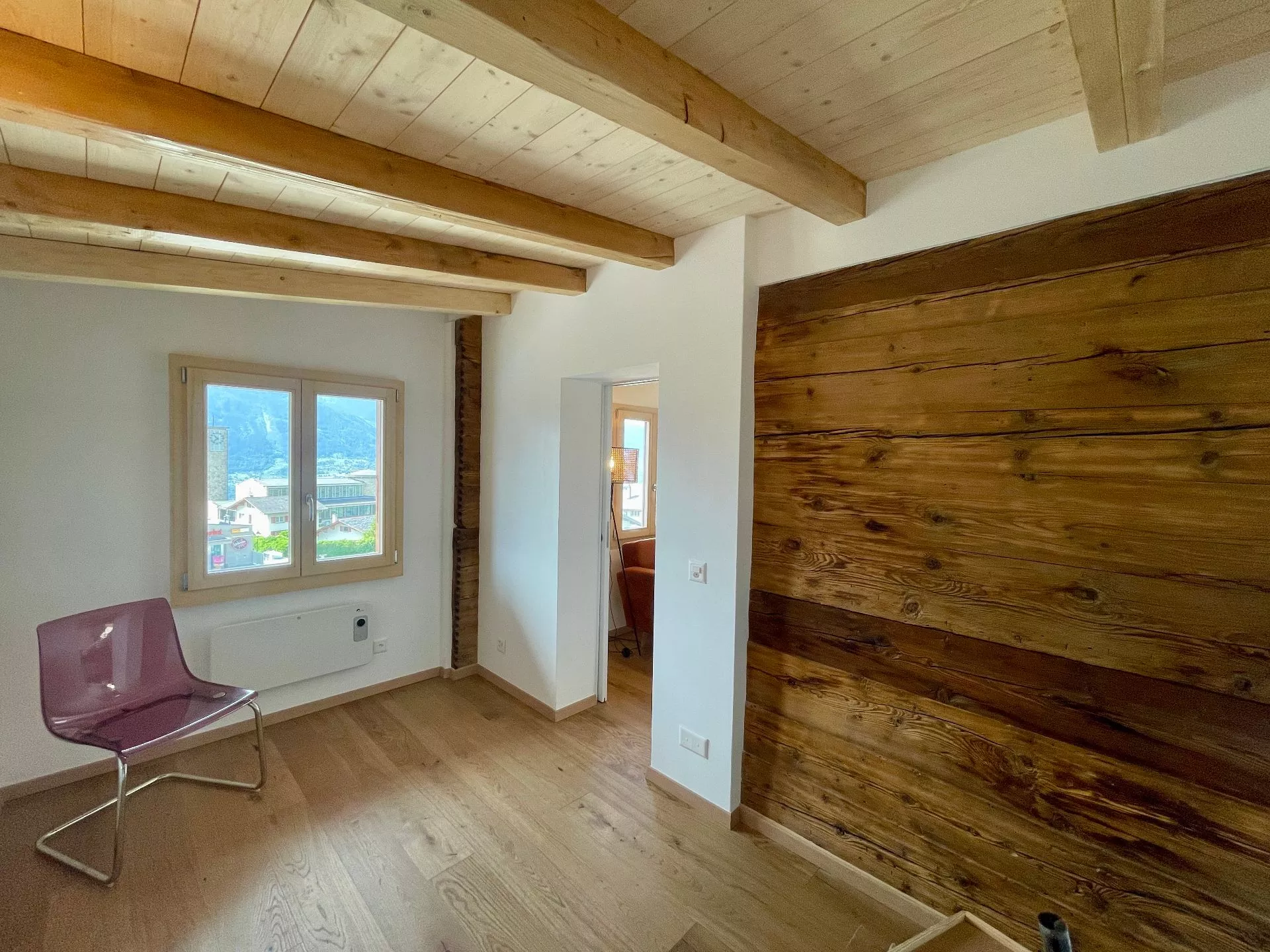L'appartement peut être régulé avec le poêle à bois et le système de climatisation (chaud ou froid) électrique.