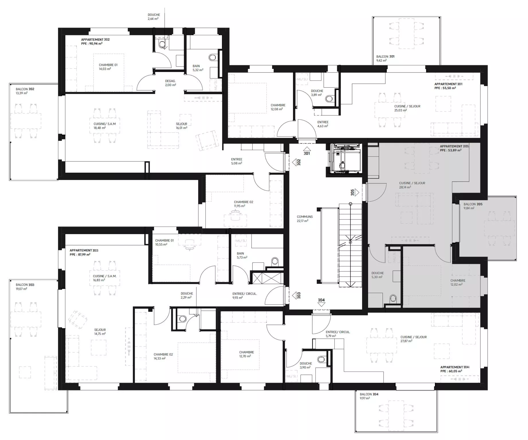 - Cave privative (1 / PPE 22) : 5,55 m²