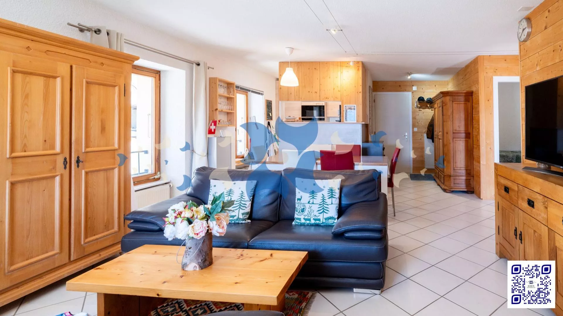 L'espace de vie est un véritable cocon de lumière, avec une cuisine semi-ouverte modernisée qui s'ouvre sur un salon/salle à manger accueillant, agrémenté de parois en bois neuves. De grandes fenêtres vous offrent une vue imprenable sur la plaine, et vous pourrez profiter d'un magnifique balcon de 10,4 m2, idéal pour savourer votre café du matin tout en admirant la majesté de la Cime de l'Est et du massif du Mont Blanc.