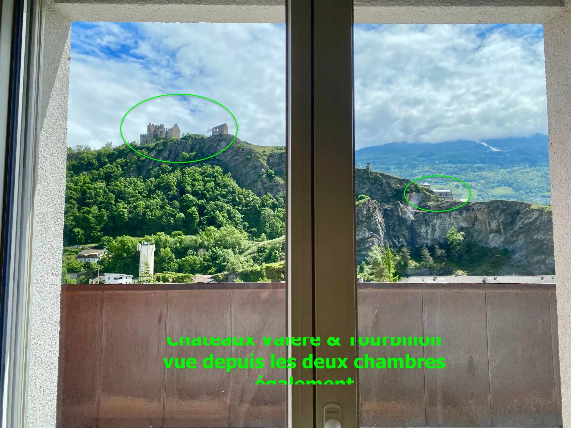 - Espaces extérieurs : Deux grandes terrasses SUD de 23m2 et 16m2 offrant une vue imprenable sur les châteaux de Sion et les montagnes environnantes