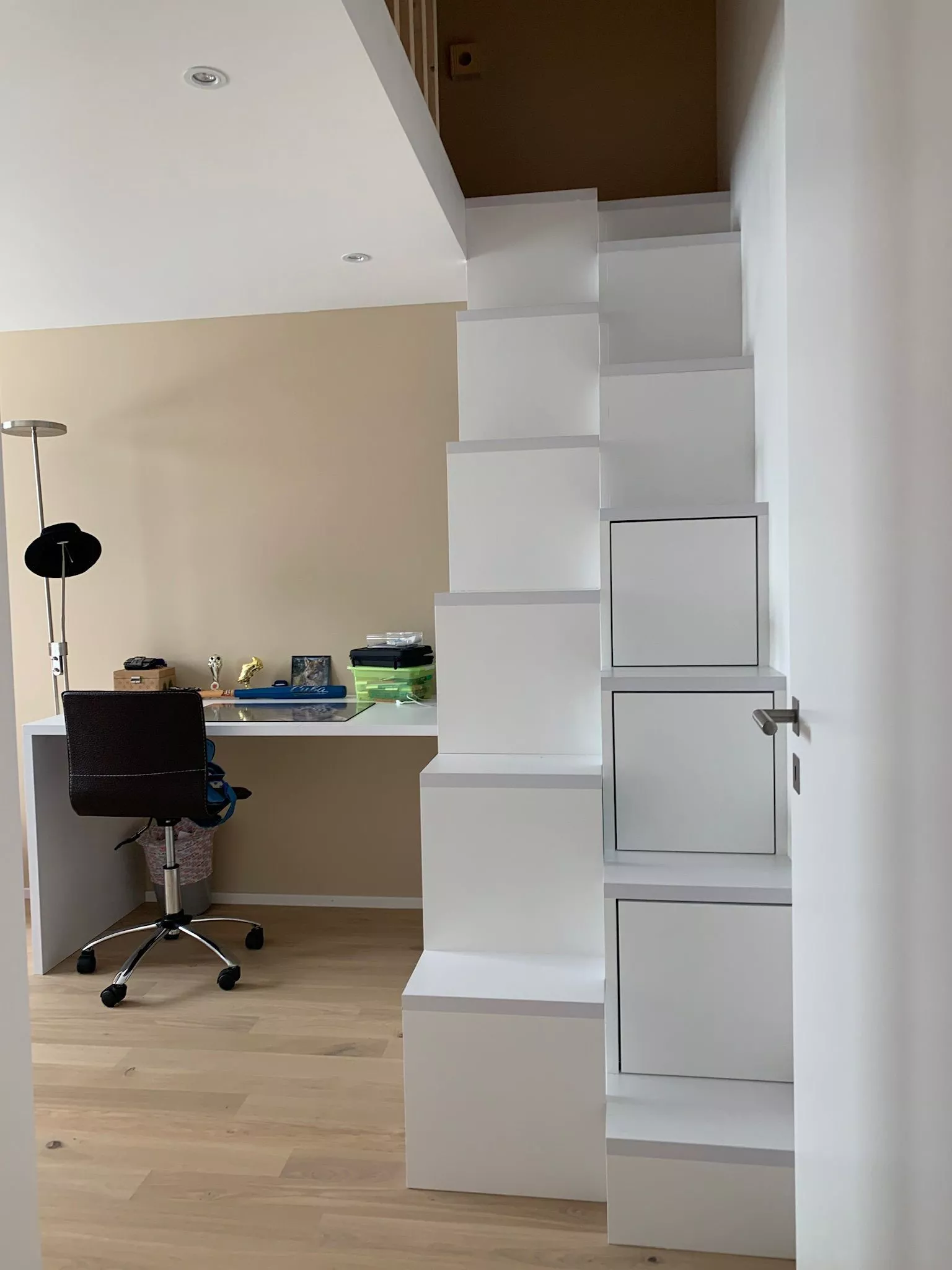 Deux chambres confortables avec mezzanine et escalier abritant des rangements sur mesure