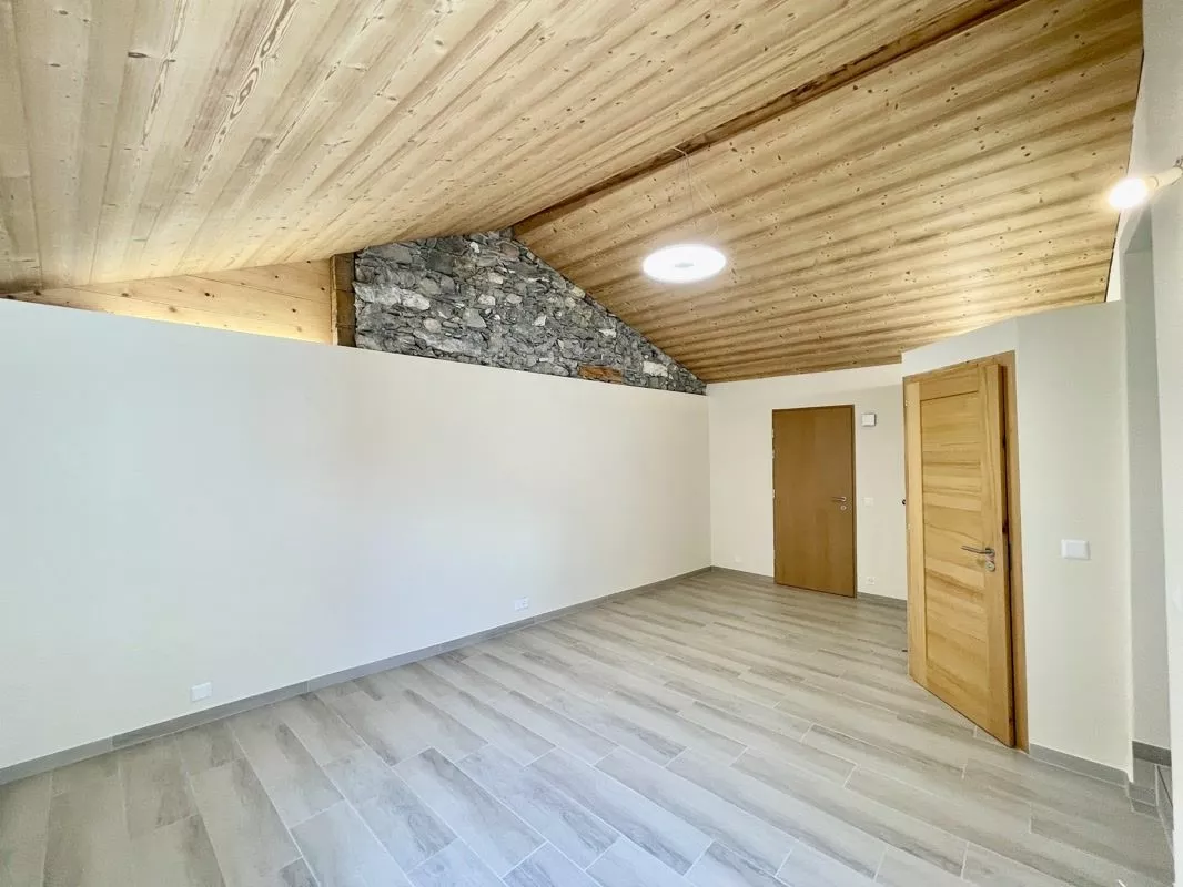 Comble :- Grand salon ouvert jusqu'au toit laissant découvrir 2 magnifiques poutres, très belle vue sur le Val d'Anniviers