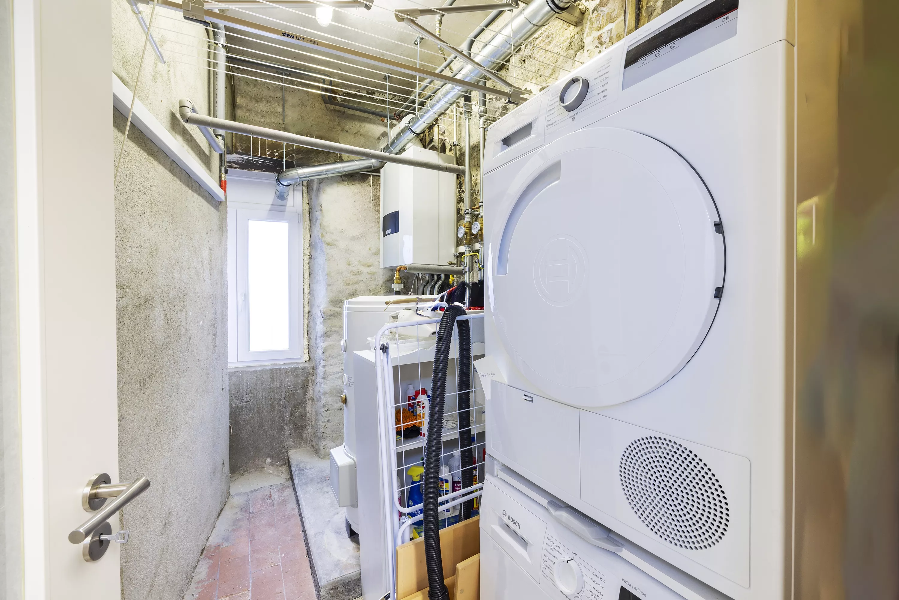 Rez-de-chaussée : cuisine habitable équipée, pièce indépendante (chambre ou séjour), salle de douche/WC, local technique avec colonne lave et sèche-linge.