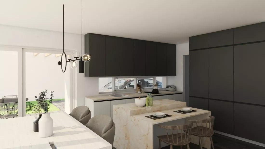 - Cuisine ouverte avec îlot et bar central