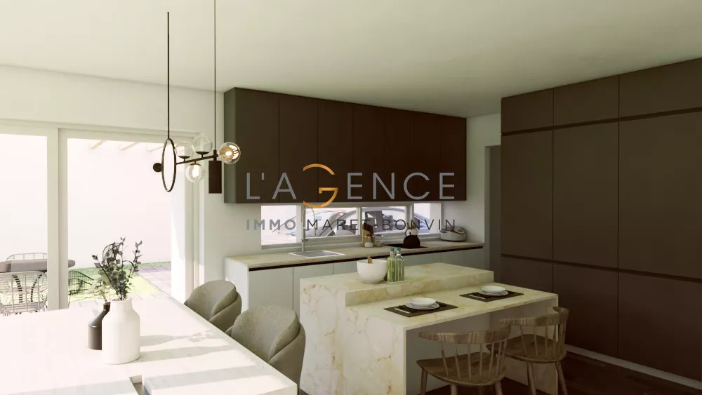 - Hall d'entrée avec armoires murales, WC visiteurs, cuisine ouverte avec îlot central, vaste séjour avec accès terrasse et jardin
