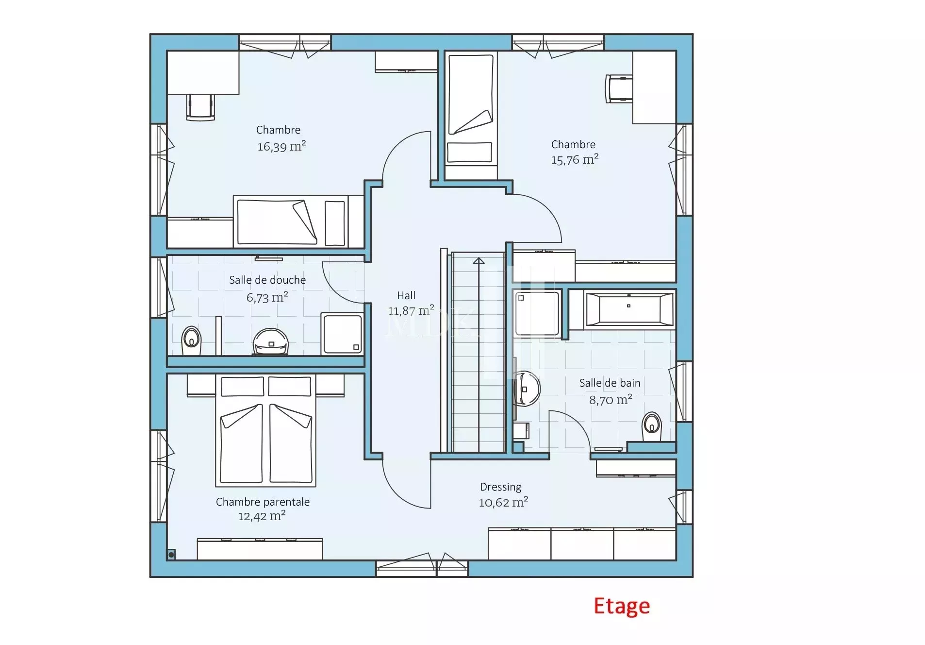 - Une chambre parentale avec dressing et une salle de bain (baignoire, douche, wc et lavabo)