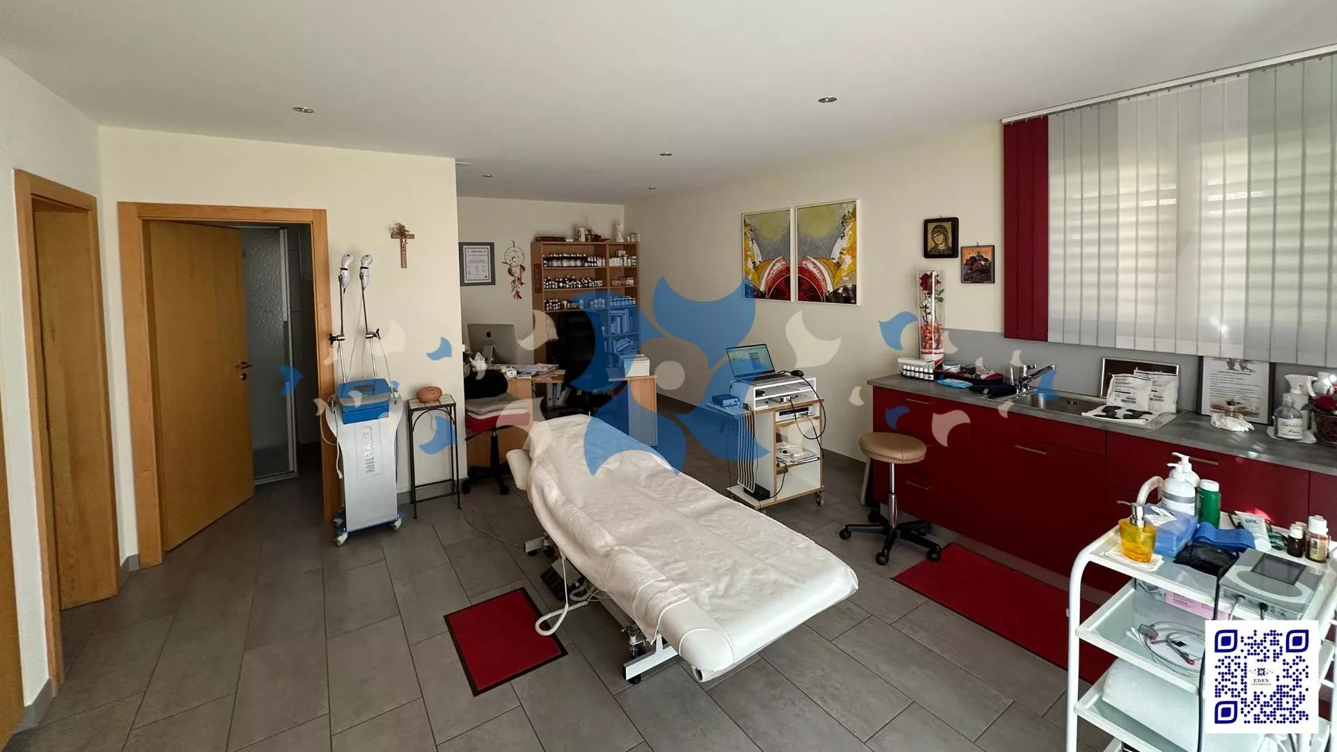 - Partie Est : Espace professionnel avec salle de thérapie, bureau, salle d'attente, WC, douche-WC, réduit (installations techniques prévues pour un studio)