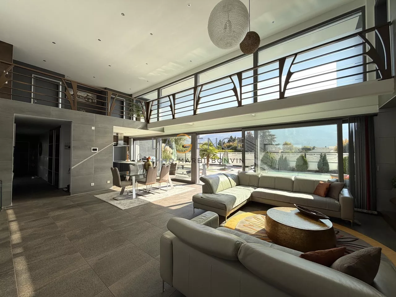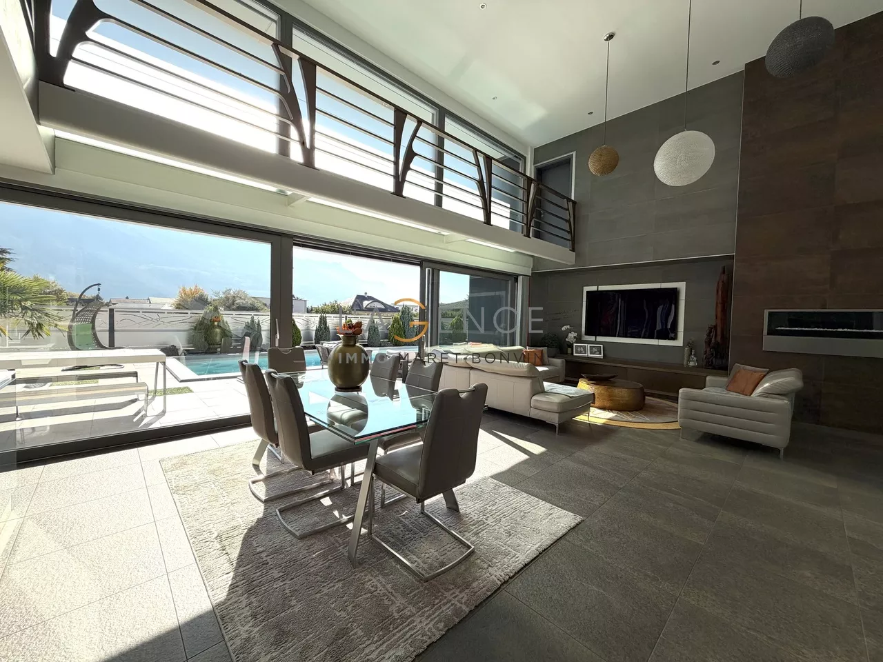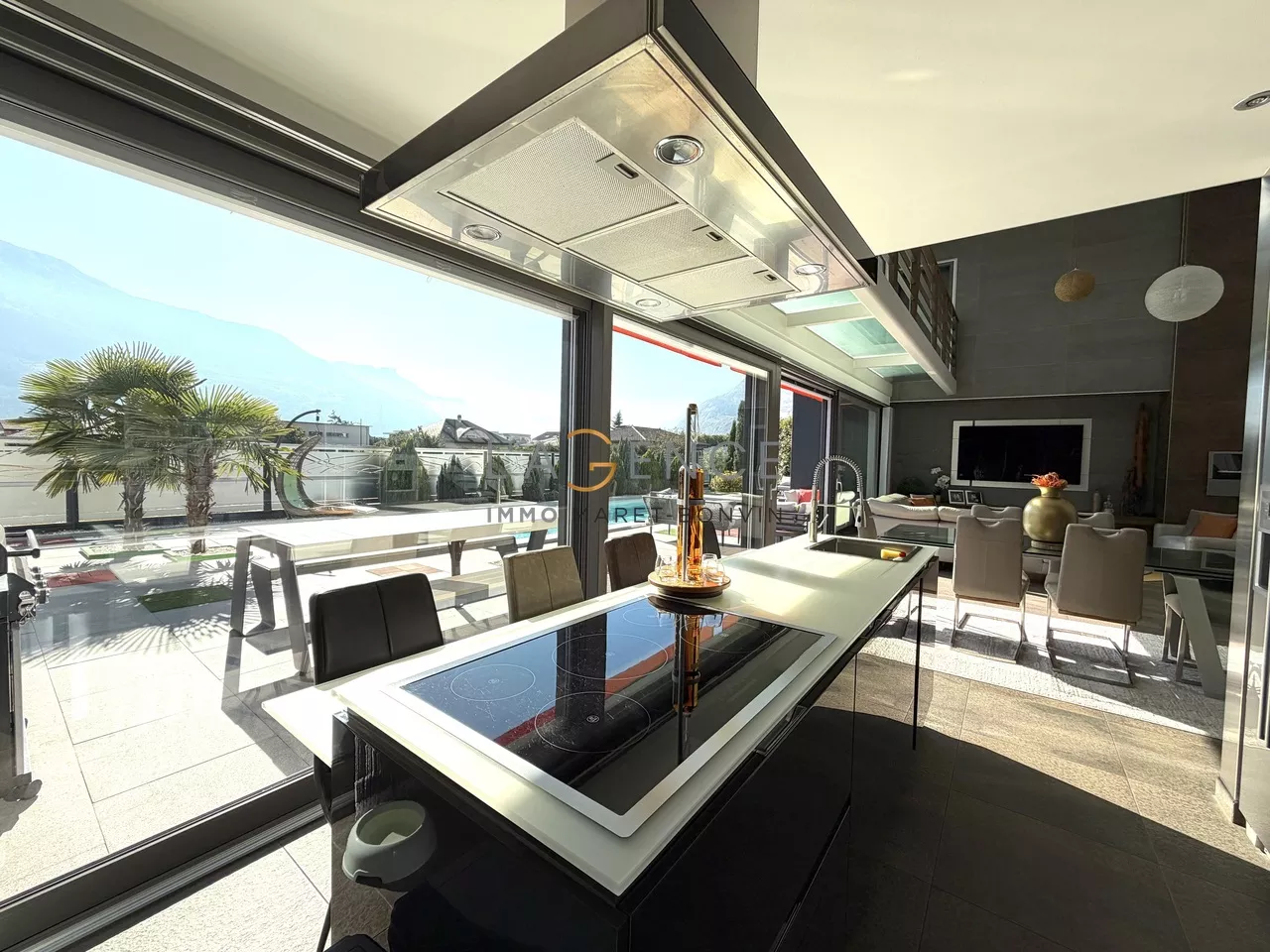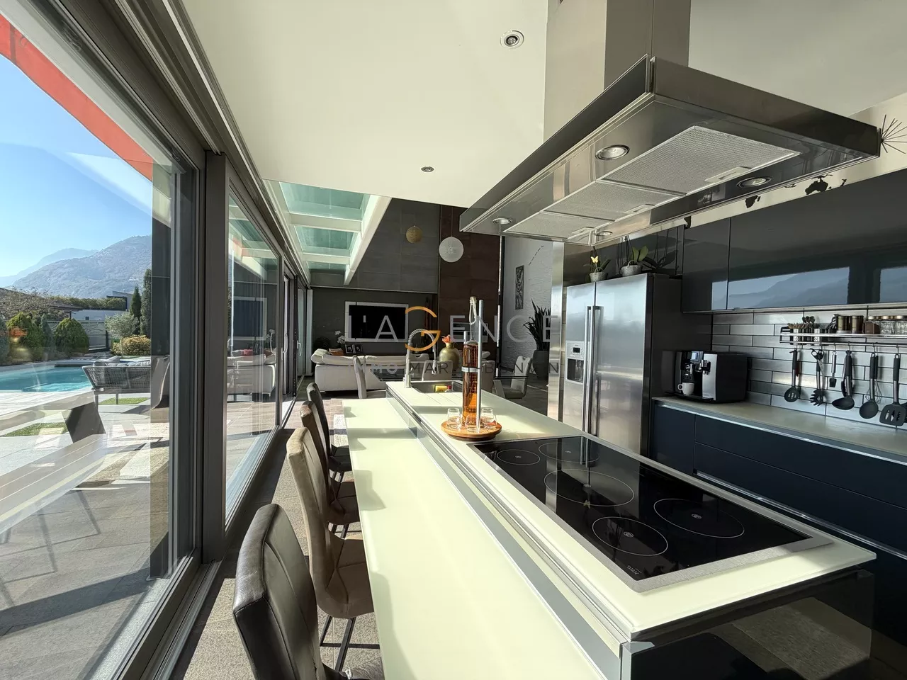 La cuisine entièrement équipée, prolongée par un économat fonctionnel, communique avec un séjour spectaculaire, baigné de lumière et ouvert sur les extérieurs.